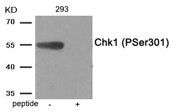 • Western blot analysis of extracts from 293 tissue using Chk1 (Phospho-Ser301) antibody.The lane on the right is treated with the antigen-specific peptide.
