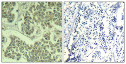 Immunohistochemical analysis of paraffin-embedded human breast carcinoma tissue using eIF2α (Phospho-Ser49) Antibody (left) or the same antibody preincubated with blocking peptide (right).