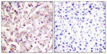 Immunohistochemical analysis of paraffin-embedded human breast carcinoma tissue, using ETS1 (Phospho-Thr38) antibody (left)or the same antibody preincubated with blocking peptide (right).