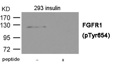 • Western blot analysis of extracts from 293 cells treated with insulin using FGFR1 (Phospho-Tyr654) Antibody.The lane on the right is treated with the antigen-specific peptide.