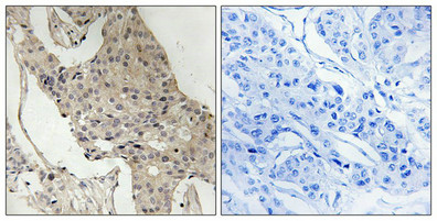 • Immunohistochemical analysis of paraffin-embedded human breast carcinoma tissue using Gab2 (Phospho-Ser623) antibody (left)or the same antibody preincubated with blocking peptide (right).