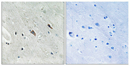 • Immunohistochemical analysis of paraffin-embedded human brain tissue using Gab2 (Phospho-Tyr643) antibody (left)or the same antibody preincubated with blocking peptide (right).