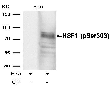 Western blot analysis of extracts from Hela cells, treated with IFNa or calf intestinal phosphatase (CIP), using HSF1 (phospho-Ser303) Antibody.