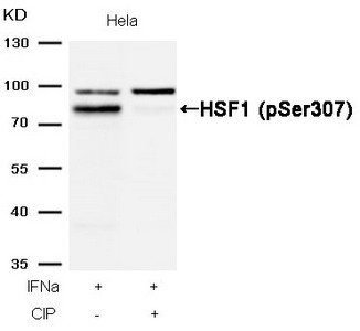 Western blot analysis of extracts from Hela cells, treated with IFNa or calf intestinal phosphatase (CIP), using HSF1 (Phospho-Ser307) Antibody.