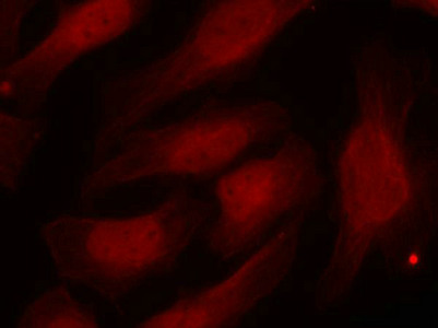 • Immunofluorescence staining of methanol-fixed Hela cells using Histone H2A.X(Phospho-Ser139) Antibody.