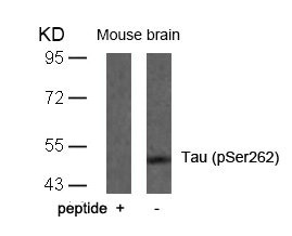 • Western blot analysis of extracts from mouse brain tissue using Tau(Phospho-Ser262) Antibody and the same antibody preincubated with blocking peptide.