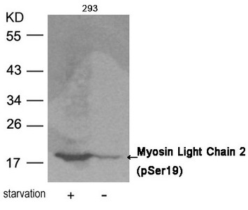 Western blot analysis of extracts from 293 cells untreated or treated with starvation using Myosin Light Chain 2 (Phospho-Ser19) Antibody.