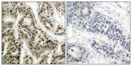 Immunohistochemical analysis of paraffin- embedded human breast carcinoma tissue using NF-kappa;B p105/p50 (phospho-Ser337) antibody.