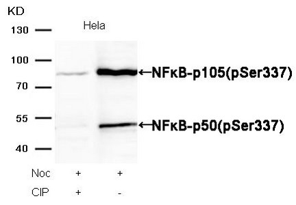 Western blot analysis of extracts from Hela cells, treated with Noc or calf intestinal phosphatase (CIP), using NF-kappa;B-p105/p50(Phospho-Ser337) Antibody.
