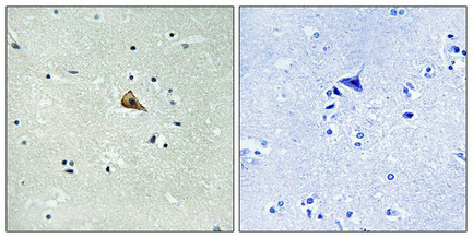 • Immunohistochemistry analysis of paraffin-embedded human brain tissue using Trk A (Phospho-Tyr701) antibody. The picture on the right is treated with the synthesized peptide.