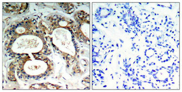Immunohistochemical analysis of paraffin-embedded human breast carcinoma tissue using SHP-2(Phospho-Tyr542) Antibody(left) or the same antibody preincubated with blocking peptide(right).