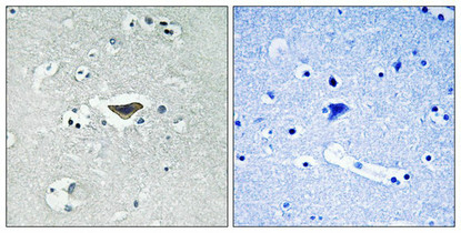 • Immunohistochemical analysis of paraffin-embedded human brain tissue using Ras-GRF1 (Phospho-Ser916) antibody (left)or the same antibody preincubated with blocking peptide (right).
