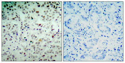 Immunohistochemical analysis of paraffin-embedded human breast carcinoma tissue using Rb(Phospho-Ser780) Antibody(left) or the same antibody preincubated with blocking peptide(right).