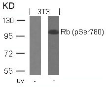 Western blot analysis of extracts from 3T3 cells untreated or treated with UV using Rb(Phospho-Ser780) Antibody.