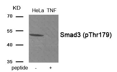• Western blot analysis of extracts from HeLa cells treated with TNF using Phospho-Smad3 (Thr179) antibody.The lane on the right is treated with the antigen-specific peptide.