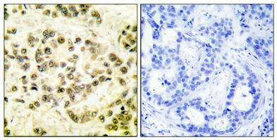 Immunohistochemical analysis of paraffin-embedded human breast carcinoma tissue using STAT5B (phospho-Ser731) antibody. The picture on the right is treated with the synthesized peptide.