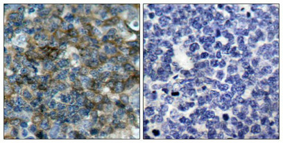 Immunohistochemical analysis of paraffin-embedded human tonsil carcinoma tissue using VASP(Phospho-Ser157) Antibody(left) or the same antibody preincubated with blocking peptide(right).