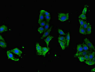 • Immunofluorescent analysis of HepG2 cells using CSB-PA019362LA01HU at dilution of 1:100 and Alexa Fluor 488-congugated AffiniPure Goat Anti-Rabbit IgG(H+L)