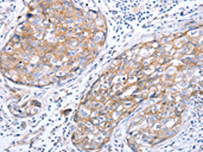 • The image on the left is immunohistochemistry of paraffin-embedded Human breast cancer tissue using CSB-PA192001(RASSF1 Antibody) at dilution 1/70, on the right is treated with synthetic peptide. (Original magnification: ×200)