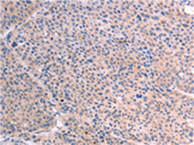 The image on the left is immunohistochemistry of paraffin-embedded Human liver cancer tissue using CSB-PA617153(RELA Antibody) at dilution 1/25, on the right is treated with fusion protein. (Original magnification: ×200)