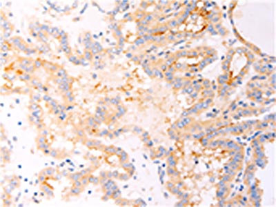 The image on the left is immunohistochemistry of paraffin-embedded Human thyroid cancer tissue using CSB-PA617153(RELA Antibody) at dilution 1/25, on the right is treated with fusion protein. (Original magnification: ×200)