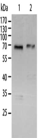 Gel: 10%SDS-PAGE, Lysate: 40 μg, Lane 1-2: A431 cells, Jurkat cells, Primary antibody: CSB-PA617153(RELA Antibody) at dilution 1/300, Secondary antibody: Goat anti rabbit IgG at 1/8000 dilution, Exposure time: 1 minute