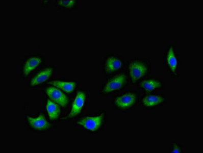 Immunofluorescent analysis of A549 cells using CSB-PA019651LA01HU at dilution of 1:100 and Alexa Fluor 488-congugated AffiniPure Goat Anti-Rabbit IgG(H+L)