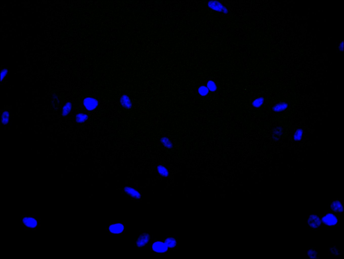 Immunofluorescence staining of Hela cell with 5% goat serum, counter-stained with DAPI. The cells were fixed in 4% formaldehyde and blocked in 10% normal Goat Serum. The cells were then incubated with the antibody overnight at 4C. The secondary antibody was Alexa Fluor 488-congugated AffiniPure Goat Anti-Rabbit IgG(H+L).