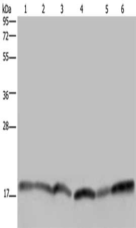 Gel: 10%SDS-PAGE, Lysate: 40 μg, Lane 1-6: Human brain malignant glioma tissue, Jurkat cells, Raji cells, 231 cells, human fetal brain tissue, Hela cells, Primary antibody: CSB-PA124825(RHEB Antibody) at dilution 1/300, Secondary antibody: Goat anti rabbit IgG at 1/8000 dilution, Exposure time: 5 seconds
