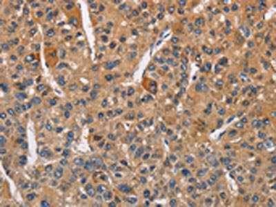 The image on the left is immunohistochemistry of paraffin-embedded Human liver cancer tissue using CSB-PA108659(RICTOR Antibody) at dilution 1/40, on the right is treated with fusion protein. (Original magnification: ×200)