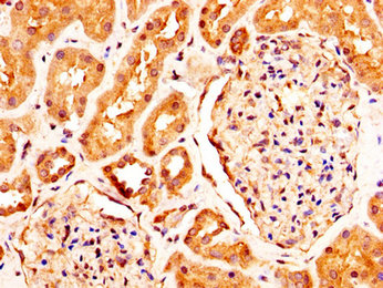 IHC image of CSB-PA819908LA01HU diluted at 1:290 and staining in paraffin-embedded human kidney tissue performed on a Leica BondTM system. After dewaxing and hydration, antigen retrieval was mediated by high pressure in a citrate buffer (pH 6.0). Section was blocked with 10% normal goat serum 30min at RT. Then primary antibody (1% BSA) was incubated at 4°C overnight. The primary is detected by a biotinylated secondary antibody and visualized using an HRP conjugated SP system.