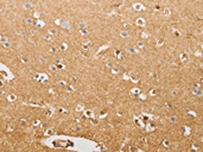 The image on the left is immunohistochemistry of paraffin-embedded Human brain tissue using CSB-PA042178(S100A1 Antibody) at dilution 1/20, on the right is treated with fusion protein. (Original magnification: ×200)