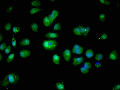 Immunofluorescent analysis of MCF-7 cells using CSB-PA853418LA01HU at dilution of 1:100 and Alexa Fluor 488-congugated AffiniPure Goat Anti-Rabbit IgG(H+L)