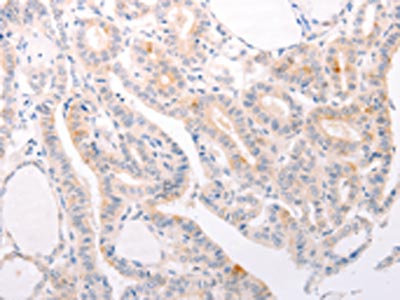 • The image on the left is immunohistochemistry of paraffin-embedded Human thyroid cancer tissue using CSB-PA682555(S1PR3 Antibody) at dilution 1/30, on the right is treated with synthetic peptide. (Original magnification: ×200)