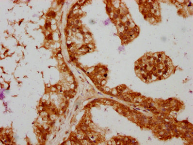 IHC image of CSB-PA875672ESR1HU diluted at 1:364 and staining in paraffin-embedded human prostate cancer performed on a Leica BondTM system. After dewaxing and hydration, antigen retrieval was mediated by high pressure in a citrate buffer (pH 6.0). Section was blocked with 10% normal goat serum 30min at RT. Then primary antibody (1% BSA) was incubated at 4°C overnight. The primary is detected by a biotinylated secondary antibody and visualized using an HRP conjugated SP system.