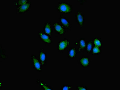 Immunofluorescent analysis of A549 cells using CSB-PA875672ESR2HU at dilution of 1:100 and Alexa Fluor 488-congugated AffiniPure Goat Anti-Rabbit IgG(H+L)