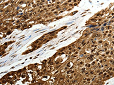 The image on the left is immunohistochemistry of paraffin-embedded Human cervical cancer tissue using CSB-PA044197(SCN1A Antibody) at dilution 1/50, on the right is treated with synthetic peptide. (Original magnification: ×200)