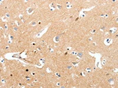 The image on the left is immunohistochemistry of paraffin-embedded Human brain tissue using CSB-PA570456(SCN9A Antibody) at dilution 1/40, on the right is treated with synthetic peptide. (Original magnification: ×200)