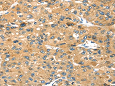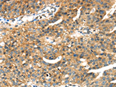 The image on the left is immunohistochemistry of paraffin-embedded Human liver cancer tissue using CSB-PA583633(SEPP1 Antibody) at dilution 1/35, on the right is treated with fusion protein. (Original magnification: ×200)