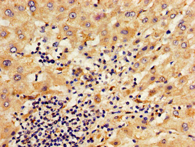 IHC image of CSB-PA021062EA01HU diluted at 1:800 and staining in paraffin-embedded human liver tissue performed on a Leica BondTM system. After dewaxing and hydration, antigen retrieval was mediated by high pressure in a citrate buffer (pH 6.0). Section was blocked with 10% normal goat serum 30min at RT. Then primary antibody (1% BSA) was incubated at 4°C overnight. The primary is detected by a biotinylated secondary antibody and visualized using an HRP conjugated SP system.