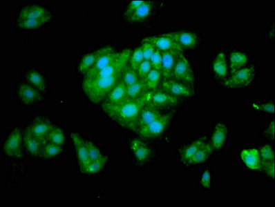 Immunofluorescence staining of HepG2 cells with CSB-PA021062EA01HU at 1:266, counter-stained with DAPI. The cells were fixed in 4% formaldehyde, permeabilized using 0.2% Triton X-100 and blocked in 10% normal Goat Serum. The cells were then incubated with the antibody overnight at 4°C. The secondary antibody was Alexa Fluor 488-congugated AffiniPure Goat Anti-Rabbit IgG(H+L).