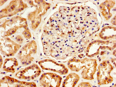 IHC image of CSB-PA021062EA01HU diluted at 1:800 and staining in paraffin-embedded human kidney tissue performed on a Leica BondTM system. After dewaxing and hydration, antigen retrieval was mediated by high pressure in a citrate buffer (pH 6.0). Section was blocked with 10% normal goat serum 30min at RT. Then primary antibody (1% BSA) was incubated at 4°C overnight. The primary is detected by a biotinylated secondary antibody and visualized using an HRP conjugated SP system.