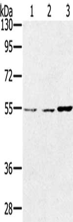 Gel: 8%SDS-PAGE, Lysate: 40 μg, Lane 1-3: Lovo cells, hela cells, SKOV3 cells, Primary antibody: CSB-PA778940(SESN2 Antibody) at dilution 1/300, Secondary antibody: Goat anti rabbit IgG at 1/8000 dilution, Exposure time: 1 minute