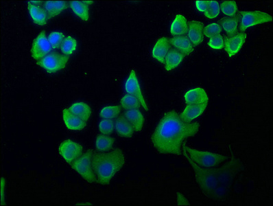 Immunofluorescence staining of Hela cells with CSB-PA021096NA01HU at 1:100, counter-stained with DAPI. The cells were fixed in 4% formaldehyde, permeabilized using 0.2% Triton X-100 and blocked in 10% normal Goat Serum. The cells were then incubated with the antibody overnight at 4°C. The secondary antibody was Alexa Fluor 488-congugated AffiniPure Goat Anti-Rabbit IgG(H+L).