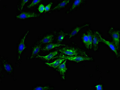 Immunofluorescence staining of Hela cells with CSB-PA854159LA01HU at 1:200, counter-stained with DAPI. The cells were fixed in 4% formaldehyde, permeabilized using 0.2% Triton X-100 and blocked in 10% normal Goat Serum. The cells were then incubated with the antibody overnight at 4°C. The secondary antibody was Alexa Fluor 488-congugated AffiniPure Goat Anti-Rabbit IgG(H+L).