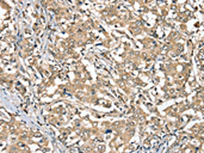 The image on the left is immunohistochemistry of paraffin-embedded Human breast cancer tissue using CSB-PA266237(SGPL1 Antibody) at dilution 1/40, on the right is treated with synthetic peptide. (Original magnification: ×200)