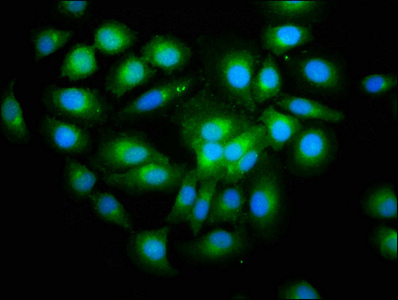 Immunofluorescence staining of A549 cells with CSB-PA818677LA01HU at 1:200, counter-stained with DAPI. The cells were fixed in 4% formaldehyde, permeabilized using 0.2% Triton X-100 and blocked in 10% normal Goat Serum. The cells were then incubated with the antibody overnight at 4°C. The secondary antibody was Alexa Fluor 488-congugated AffiniPure Goat Anti-Rabbit IgG(H+L).