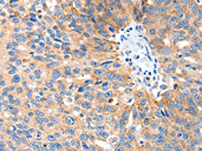 The image on the left is immunohistochemistry of paraffin-embedded Human ovarian cancer tissue using CSB-PA547464(SLC2A1 Antibody) at dilution 1/40, on the right is treated with synthetic peptide. (Original magnification: ×200)
