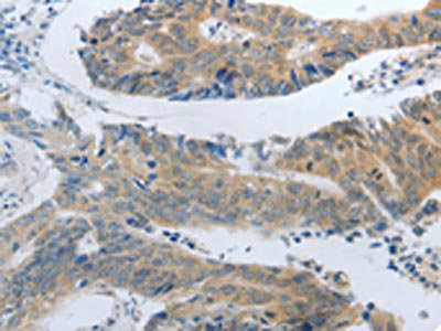 The image on the left is immunohistochemistry of paraffin-embedded Human colon cancer tissue using CSB-PA276678(SLC5A5 Antibody) at dilution 1/30, on the right is treated with synthetic peptide. (Original magnification: ×200)