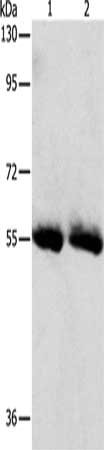 Gel: 8%SDS-PAGE, Lysate: 40 μg, Lane 1-2: Human colon tissue, Human ovarian cancer tissue, Primary antibody: CSB-PA276678(SLC5A5 Antibody) at dilution 1/450, Secondary antibody: Goat anti rabbit IgG at 1/8000 dilution, Exposure time: 1 minute